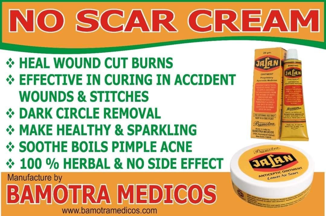 Bamotra Medicos Jalan Ointment Say goodbye to scars with Jalan Ointment! Are you tired of dealing with scars from burns, accidents, or acne? Look no further - Jalan Ointment is here to rescue your skin! This Ayurvedic antiseptic cream with turmeric not only fights marks and scars but also works wonders on dry skin, black spots, and cracked nipples. With no side effects, Jalan Ointment is your year-round protector for flawless skin. Try Jalan today and experience the natural healing power of Ayurveda!