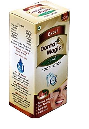 excel harbal tooth lotion use of 3 in 1 benifit 1- as tooth lotion 2- as amouth freshner 3- as a pain killer it remove bed smell in mouth ,gumswelling pyorya