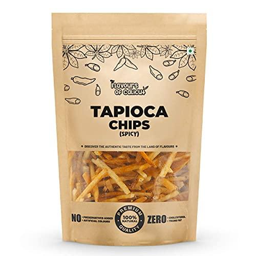 - Flavours of Calicut Spicy Tapioca chips are made of fresh tapioca (cassava roots) deep fried in edible veg oil. Tapioca chips is a high-carb & gluten-free crunchy snack with zero cholesterol & trans Fat.