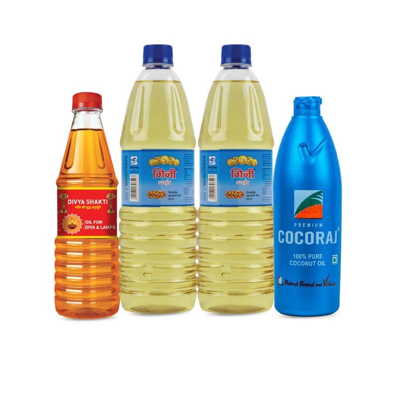 Guinea Refined Peanut Oil 2L + Coconut Oil Bottle 500 ML + Pooja Oil 450 ML - Festival Offer I Diwali I Groundnut I Moongphali I Sing I Cooking I Edible Oil + Coconut Oil + Sesame Oil I (Pack of 4)