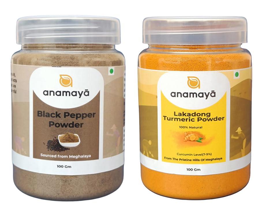 - Shillong's Finest Pair: Anamaya's Combo of Black Pepper Powder and Lakadong Turmeric Powder, each in a 100g jar, brings the unique flavors of Shillong to your kitchen. Elevate your dishes with this exquisite combination.