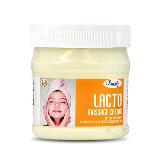 - Luster Lacto Massage Cream with Natural Extracts Helps Removes bacteria toxins dirt and oil from the pores giving you fresh radiating skin & also Restoring Natural Fairness of Skin and Also Pigmentation. Massage Cream for Women & Men and It suits all types of Face skin.