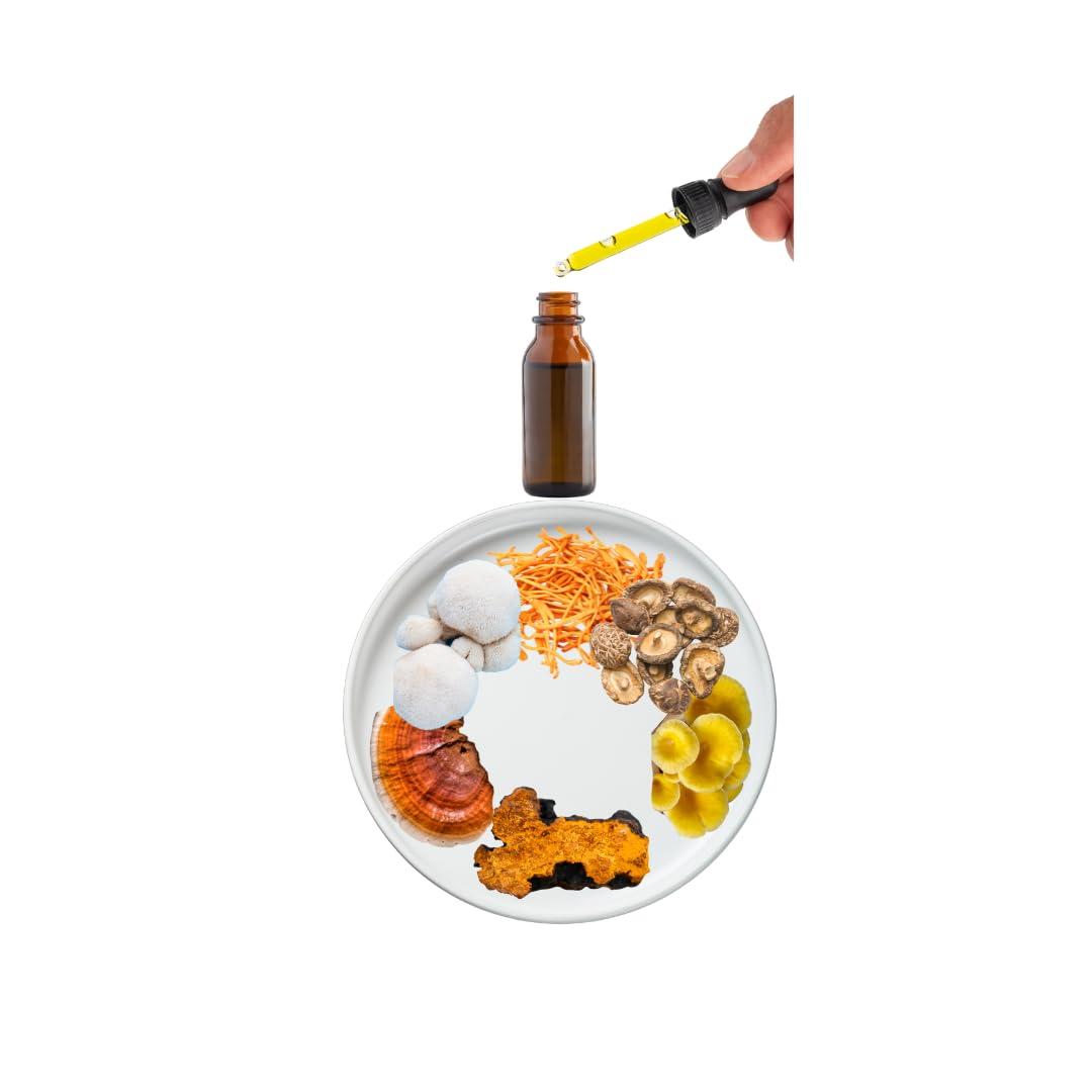 - Multi-Mushroom Blend: Combines Cordyceps, Lion's Mane, Reishi, Shiitake, and Wood Ear mushrooms for comprehensive health benefits. High Potency: 30ml bottle with 60 servings, ensuring long-lasting supply and consistent daily support. Immune Health Support: Powerful blend designed to enhance your body's natural defense mechanisms. Cognitive Health Benefits: Lion's Mane supports brain health, improving focus, memory, and cognitive function. Adaptogenic Properties: From Reishi and Cordyceps.