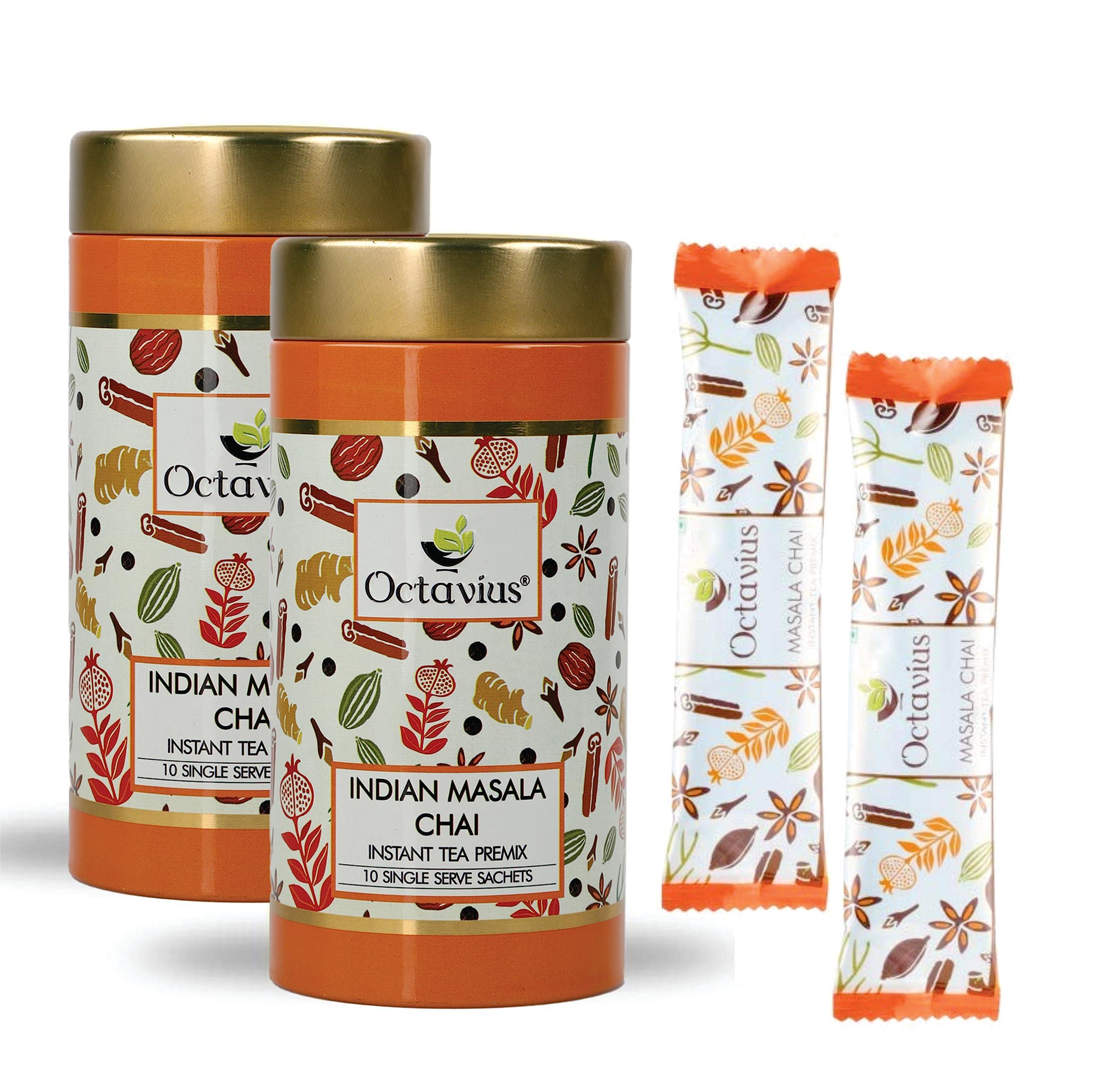 - TASTES JUST LIKE THE HOMEMADE CHAI - Octavius Indian Masala Instant Tea Premix makes the perfect cup of Indian Masala Chai ,tasting just like the globally popular Indian homemade masala chai. This On-the-Go Instant Hot Chai Premix is made with natural tea extract and the natural extracts of aromatic Indian Spices which include cardamom, ginger, cloves,black pepper and cinnamon. The ginger and pepper elements in the blend add extra warmth along with Cardamom.