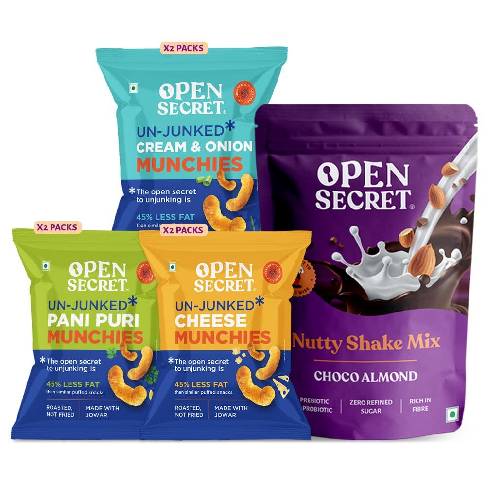 - Healthy Snacks Hamper:- 1 Choco Almond Shake mix+2 Cheese Puff Snacks + 2 Cream and onion Puff snack + 2 Panipuri puff snack
