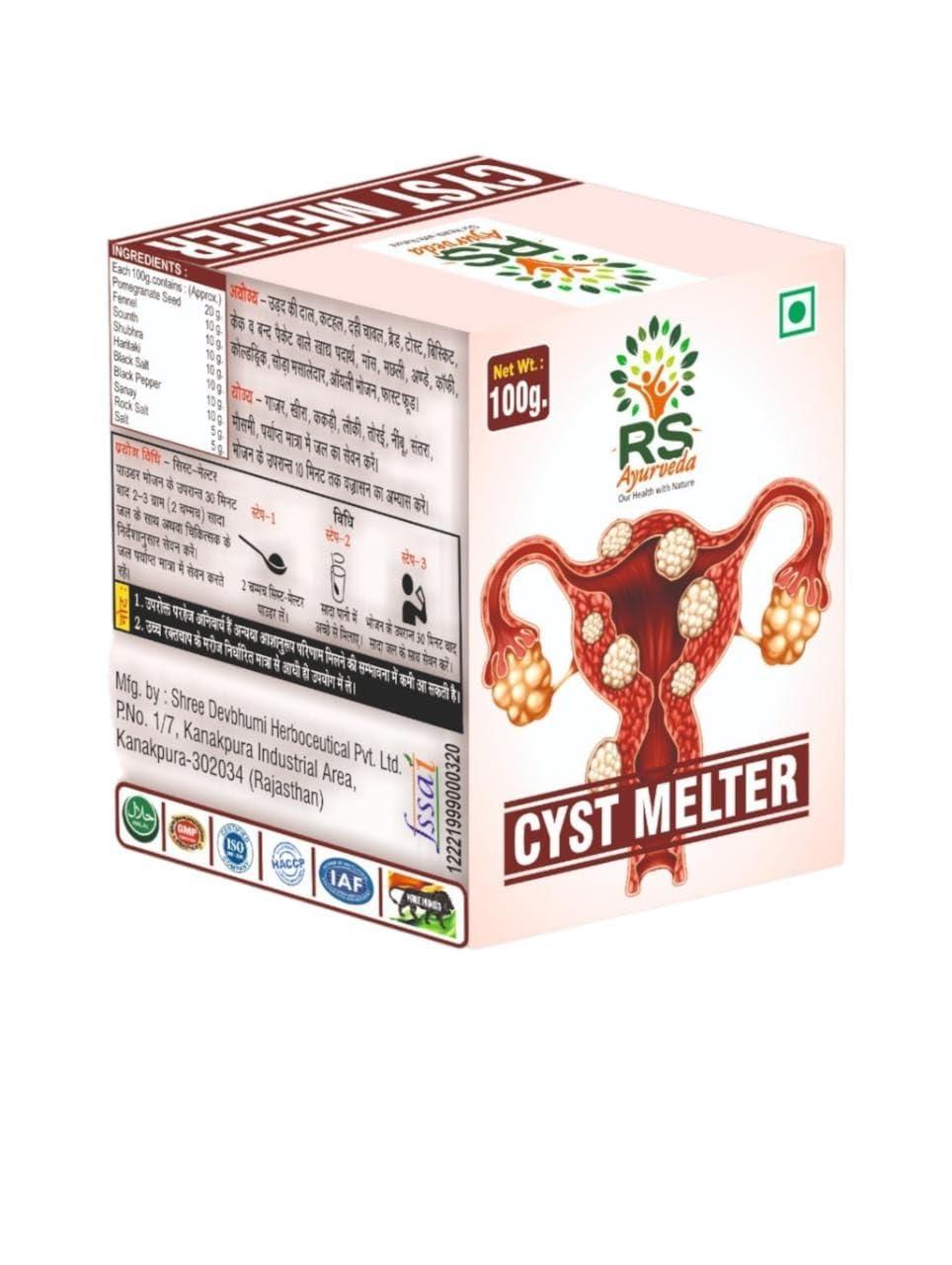 - RS Ayurveda Cyst Melter is a 100-gram Ayurvedic solution specifically designed for effective cyst management.