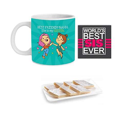 - Gift set contents: 1 Mug, 1 Coaster, Kaju Katli sweets - 100 gm for sister